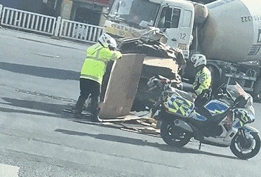 “当时是早高峰期间,路口车流量挺大的。老人家年龄比较大,看上去也有些紧张。我们是将摩托车停在三轮车两侧,起到一个临时的防护作用,再帮助老人捡起地上的纸皮,将纸皮都捆绑好后,护送他到安全的区域。整个过程花了五分钟左右,随后道路也恢复正常通行。”