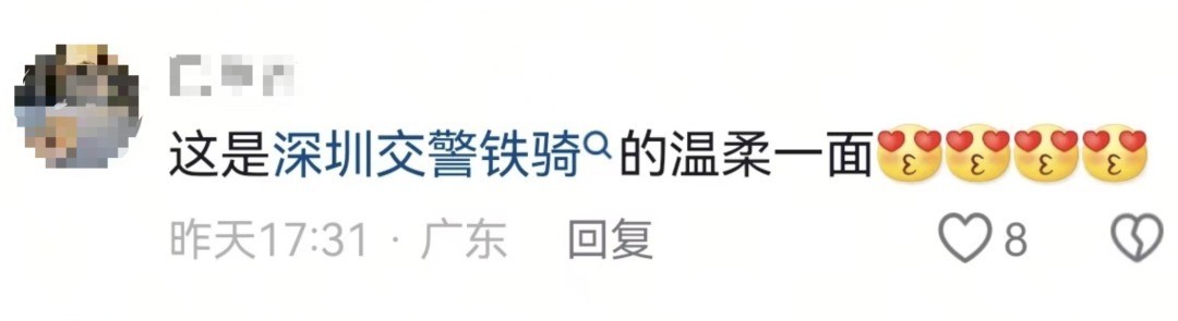 随后,记者从深圳市公安局交通警察局了解到,视频中的两名铁骑为光明交警大队公明中队的李春旺和彭俊逸。李春旺是一名“80后”,广西人,从事铁骑这份工作已有13个年头。彭俊逸是“90后”,广东人,从事这项工作也有近8年。