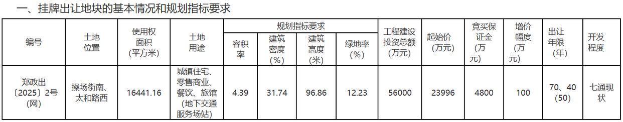 【大河财立方消息】2月11日,经郑州市人民政府批准,郑州市自然资源和规划局决定以网上挂牌方式出让郑政出〔2025〕2号(网)地块的国有建设用地使用权。该宗地块位于郑州市操场街南、太和路西,为旧城改造项目用地,出让面积16441.16平方米(约24.66亩),容积率要求4.39,建筑高度96.86米,绿地率12.23%,起始价为23996万元。
